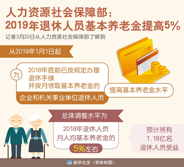 新華社北京3月20日電(記者葉昊鳴)記者20日從人力資源社會保障部了解到,從2019年1月1日起,為2018年底前已按規(guī)定辦理退休手續(xù)并按月領(lǐng)取基本養(yǎng)老金的企業(yè)和機關(guān)事業(yè)單位退休人員提高基本養(yǎng)老金水平,總體調(diào)整水平為2018年退休人員月人均基本養(yǎng)老金的5%左右,預(yù)計將有1.18億名退休人員受益。