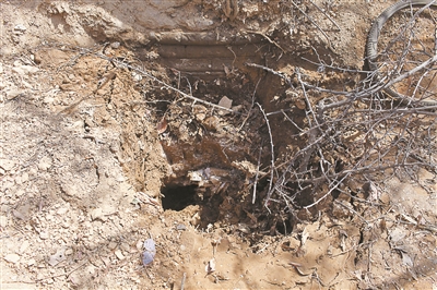 2014年夏季的一個雨夜過后,當(dāng)?shù)卮迕癜l(fā)現(xiàn)寶頂周圍一片狼藉,地里的蔬菜被踩得東倒西歪,雜亂的腳印徑直通向?qū)氻敚瑢氻斍暗哪嗤烈灰怪g變得新鮮松軟,像是被人松動過。村民判斷,必定是有人在夜幕的掩護下,悄悄潛入小院對寶頂進行盜挖,而后回填是為掩人耳目。這伙人挖了多深、挖到了什么則不得而知。此后,村民在澆地時,盜挖處出現(xiàn)沉降,并隱約露出一個盜洞口。