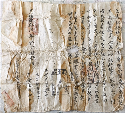 墓主人有可能姓朱。寶頂西北,是王鳳榮家的宅院。王女士收拾屋子時,曾發(fā)現(xiàn)一張百年前的《土地買賣文書》。這張宣紙文書有A3紙大小,綿軟泛黃,滿是褶皺。王鳳榮將其小心翼翼地攤在茶幾上,呈現(xiàn)出一篇并不算美觀的毛筆字,其大意為:賣主名叫朱自旺,因手頭缺錢,將祖遺民地一處四畝,賣予王永旺名下,賣價文銀十五兩,立字為證,光緒二十三年(1897年)。文書上還有三處紅章,但字跡已是漫漶不清。