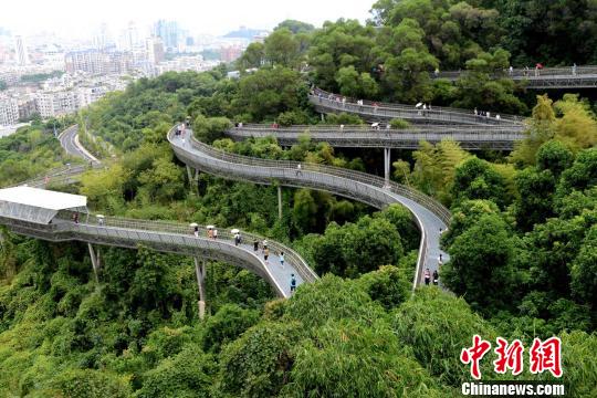 “福道”依山而建,蜿蜒前行,穿行在山林中。全線規(guī)劃總長約19公里,橫貫象山、后縣山、梅峰山、金牛山等山體,連接福州五大公園,是福州市首條城市山水生態(tài)休閑健身走廊。在“樹冠”上行走,在森林中穿梭,這是“福道”帶給許多人的別樣體驗(yàn)。