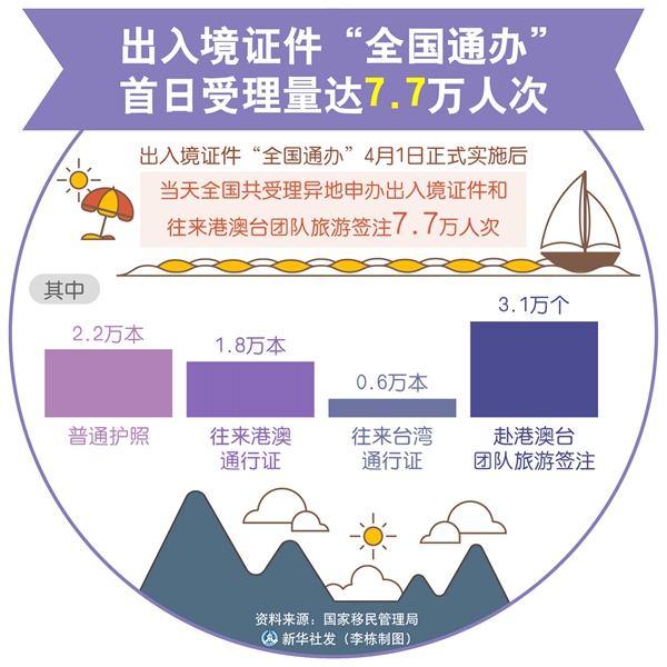 新華社北京4月2日電 記者2日從國家移民管理局獲悉,出入境證件“全國通辦”1日正式實施后,當(dāng)天全國共受理異地申辦出入境證件和往來港澳臺團(tuán)隊旅游簽注7.7萬人次,其中普通護(hù)照2.2萬本、往來港澳通行證1.8萬本、往來臺灣通行證0.6萬本、赴港澳臺團(tuán)隊旅游簽注3.1萬個。