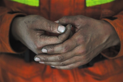昨日下午,從火場(chǎng)返回駐地的消防員胡顯祿,雙手還是被煙火熏黑的顏色。記者 吳江