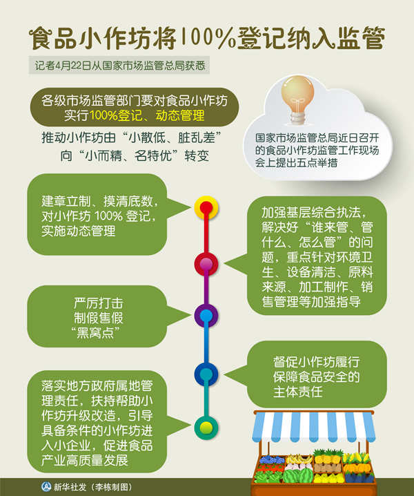 新華社北京4月22日電(記者趙文君)記者22日從國家市場監(jiān)管總局獲悉,各級市場監(jiān)管部門要對食品小作坊實行100%登記、動態(tài)管理,推動小作坊由“小散低、臟亂差”向“小而精、名特優(yōu)”轉(zhuǎn)變。