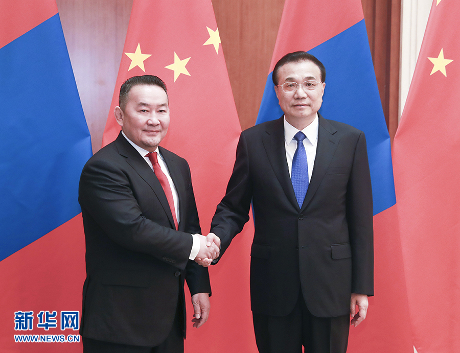 李克強(qiáng)表示,中蒙是山水相連的友好鄰邦。今年適逢中蒙建交70周年和《中蒙友好合作關(guān)系條約》修訂25周年,兩國(guó)關(guān)系迎來新的發(fā)展機(jī)遇。習(xí)近平主席將同總統(tǒng)先生舉行會(huì)談,規(guī)劃兩國(guó)關(guān)系下一步發(fā)展。中方愿同蒙方加強(qiáng)政治互信,尊重彼此核心利益和重大關(guān)切,推動(dòng)中蒙全面戰(zhàn)略伙伴關(guān)系再上新臺(tái)階。我們?cè)冈谙嗷プ鹬?、平等合作、互利互惠的基礎(chǔ)上深化雙方務(wù)實(shí)合作,將“一帶一路”倡議同蒙方“發(fā)展之路”倡議對(duì)接,加快推進(jìn)中蒙自貿(mào)協(xié)定和經(jīng)濟(jì)合作區(qū),深化在農(nóng)業(yè)、產(chǎn)能、人文等領(lǐng)域的交流合作,繼續(xù)在邊境運(yùn)輸、口岸建設(shè)等方面為蒙方提供便利。