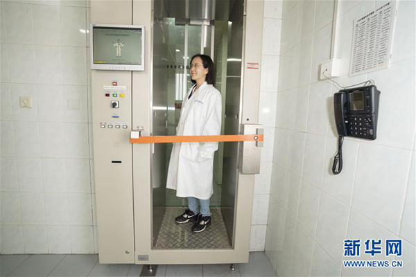 在中核集團(tuán)中國原子能科學(xué)研究院,媒體記者在參觀完中國先進(jìn)研究堆后,都要經(jīng)過一個特別的安檢門,通過檢測確定沒有受到輻射污染才能夠離開(4月17日攝)。新華社記者 才揚(yáng) 攝