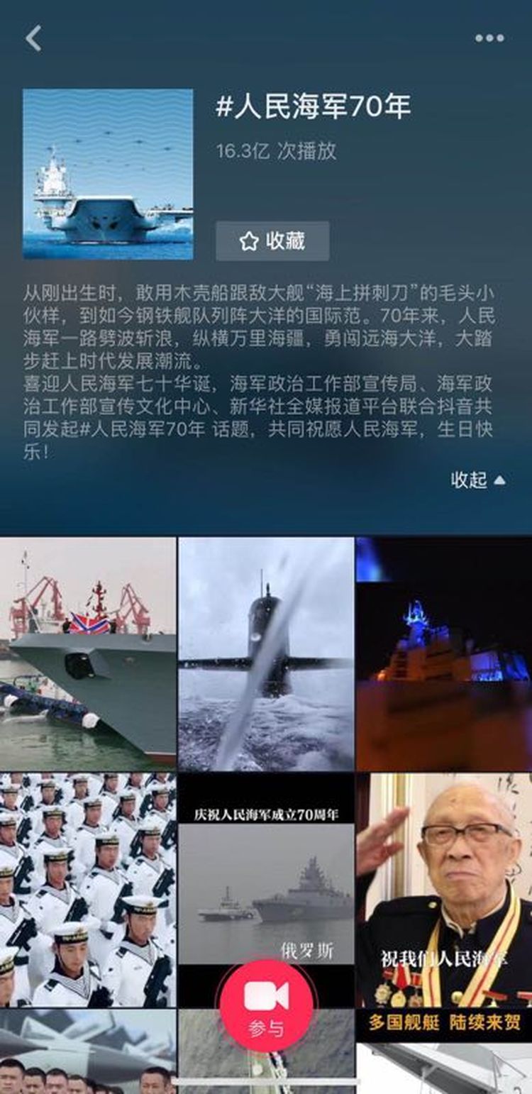 在抖音聯(lián)合發(fā)起#人民海軍70年#話題