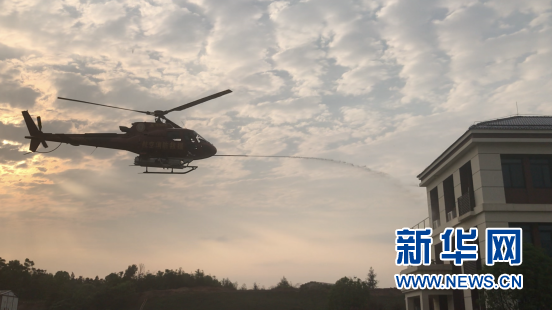 圖為消防直升機對著火建筑進行滅火水劑噴射。新華網 黃浩攝