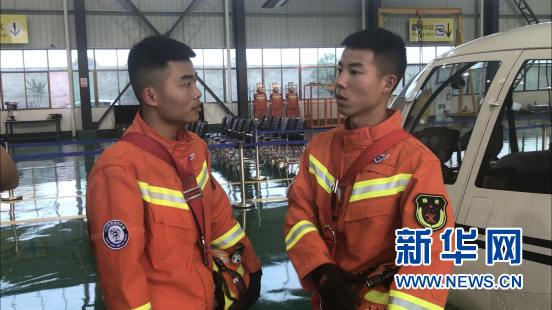 圖為消防員(左唐運德,右李金地)進行演練后經驗交流。新華網 黃浩 攝
