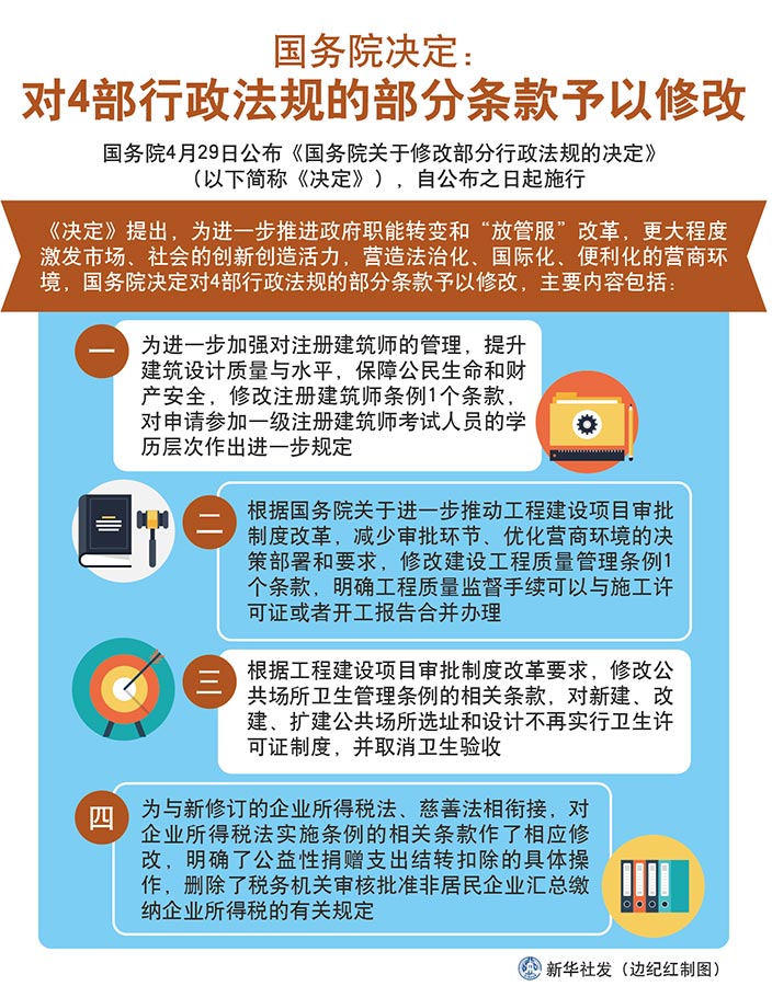 為進(jìn)一步推進(jìn)政府職能轉(zhuǎn)變和“放管服”改革,更大程度激發(fā)市場、社會的創(chuàng)新創(chuàng)造活力,營造法治化、國際化、便利化的營商環(huán)境,國務(wù)院對涉及的行政法規(guī)進(jìn)行了清理。經(jīng)過清理,國務(wù)院決定:對4部行政法規(guī)的部分條款予以修改。