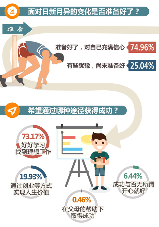 大學生的自信還體現在希望通過努力獲得成功。93.1%的受訪者希望“好好學習,從事理想工作”“通過創(chuàng)新、創(chuàng)業(yè)等方式實現人生價值”。在采訪中,不少大學生表示“只要有想法就敢去做”“相信未來有無限可能”。中國地質大學(北京)信息工程學院兼職輔導員王洪宇說,現在的大學生不拘泥于傳統,更愿意參與創(chuàng)新創(chuàng)業(yè),他們甚至會自己創(chuàng)立新工種,把青年特質發(fā)揮到極致。分析認為,這一代大學生成長在國家快速發(fā)展、改革開放不斷深化、國際地位不斷上升、互聯網與生活緊密融合的時代,他們的成長環(huán)境更加優(yōu)越,視野更加開闊,這對他們的自我認知及性格形成有很大影響,他們更加自信。