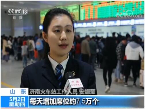 濟(jì)南火車站工作人員 安娜瑩:我們?cè)鲩_列車216趟,320趟動(dòng)車組列車由八節(jié)車廂改為十六節(jié)車廂重聯(lián)運(yùn)行,每天增加席位約7.5萬個(gè)。