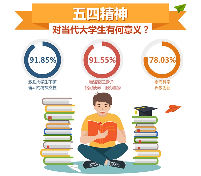 漫步今天的北大校園,我們仿佛又聽到穿越百年歷史時空的聲音。未名湖畔樹木蔥郁,博雅塔旁書香沁人,攜帶書籍的莘莘學(xué)子在校園內(nèi)急步而行。正如北京大學(xué)學(xué)生張棟杰所說:“青春是用寶貴的年華去做一件祖國需要的事,拼盡全力、毫無保留”。91.85%的受訪大學(xué)生認為五四精神“是激勵大學(xué)生不懈奮斗的精神支柱”,91.55%的受訪大學(xué)生認為五四精神“能增強愛國意識,銘記使命,服務(wù)國家”。他們都認為,這個時代可以有小我,但心中一定要有我們的祖國,五四精神永不過時。