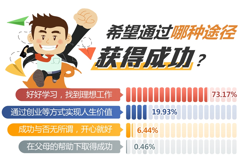 問卷調(diào)查中,93.1%的受訪大學(xué)生希望通過“好好學(xué)習(xí),找到理想工作”和“通過創(chuàng)業(yè)等方式實現(xiàn)人生價值”兩種途徑獲得成功。