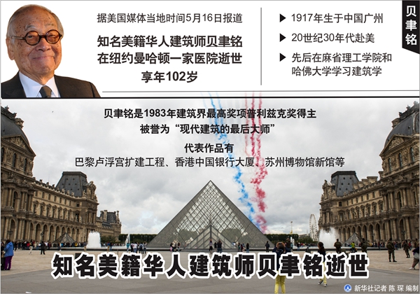 新華社紐約5月16日電(記者長遠 潘麗君)據(jù)美國媒體16日報道,知名美籍華人建筑師貝聿銘在紐約曼哈頓一家醫(yī)院逝世,享年102歲。