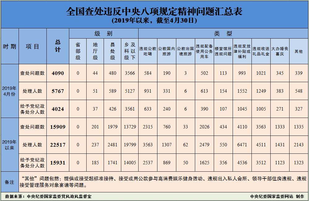 據(jù)中央紀委國家監(jiān)委網(wǎng)站消息,為掌握全國貫徹落實中央八項規(guī)定精神情況,中央紀委在各省區(qū)市和新疆生產(chǎn)建設兵團、各中央和國家機關、各中央企業(yè)和中央金融企業(yè)等建立了落實中央八項規(guī)定精神情況月報制度。2019年以來,截至4月30日,全國查處違反中央八項規(guī)定精神問題情況如下: