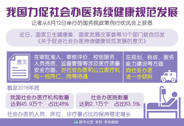 新華社北京6月12日電(記者張泉、屈婷)記者從12日舉行的國(guó)務(wù)院政策例行吹風(fēng)會(huì)上獲悉,近日,國(guó)家衛(wèi)生健康委、國(guó)家發(fā)展改革委等10個(gè)部門(mén)聯(lián)合印發(fā)《關(guān)于促進(jìn)社會(huì)辦醫(yī)持續(xù)健康規(guī)范發(fā)展的意見(jiàn)》,立足社會(huì)辦醫(yī)的定位和發(fā)展方向,在鞏固和加強(qiáng)前期工作的基礎(chǔ)上,又推出一批鼓勵(lì)支持政策。