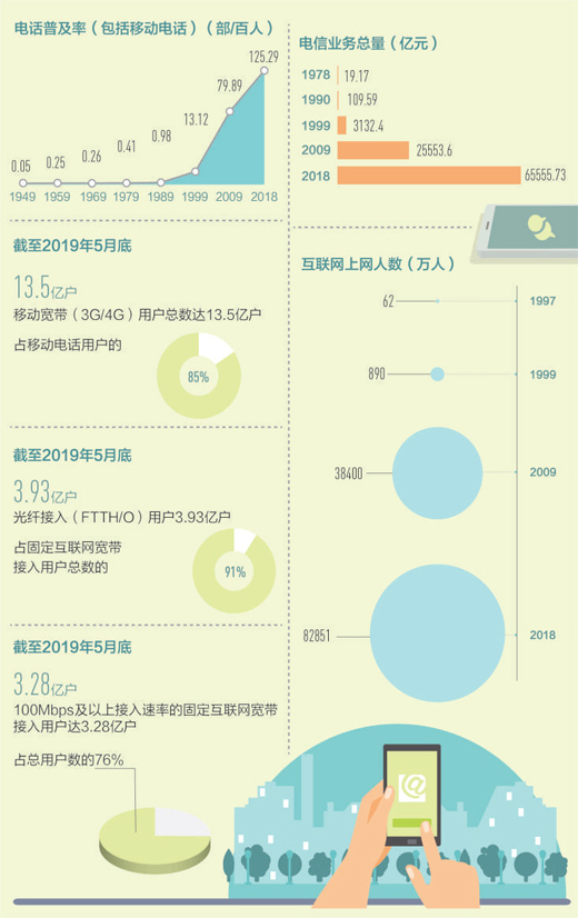 從單一種類到多種通信方式并存。2018年,我國電話普及率(包括移動電話)為125.29部/百人,固定互聯(lián)網(wǎng)寬帶接入用戶40738萬戶,移動寬帶用戶130565萬戶,互聯(lián)網(wǎng)上網(wǎng)人數(shù)從1997年的62萬人迅速上升至82851萬人。用得上、用得起、用得好的信息服務正在惠及更多百姓,億萬人民在共享互聯(lián)網(wǎng)發(fā)展成果上擁有更多獲得感、幸福感和安全感。
