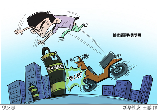 漫畫(huà):須反思 近日,一位鄭州市民騎電動(dòng)車(chē)撞上隔離樁受傷,經(jīng)搶救無(wú)效死亡。記者在鄭州采訪了解到,醫(yī)院曾接診過(guò)很多撞隔離樁的受傷者,有的破皮流血,有的刺穿腳掌,有的摔斷腿骨。隔離樁變“傷人樁”警示城市管理不能任性粗放,應(yīng)堅(jiān)持以人為本,要像繡花一樣精細(xì),否則害民不淺。新華社發(fā) 王鵬 作