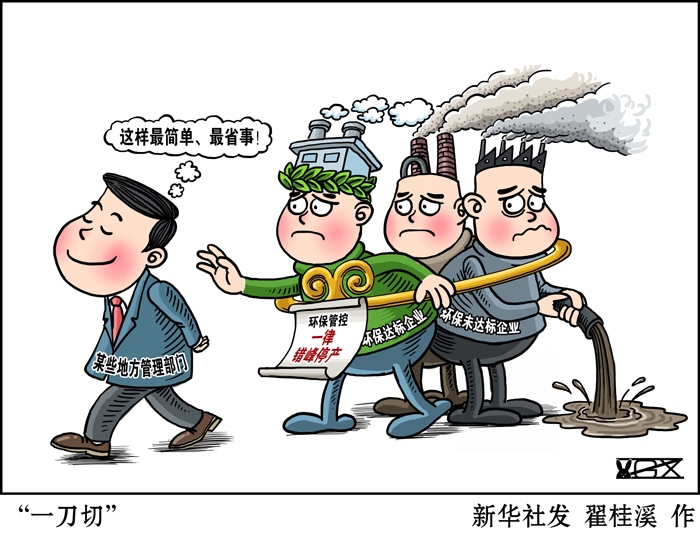 值得注意的是,有些地方“一刀切”政策開(kāi)始搞移花接木。中部多家企業(yè)的相關(guān)負(fù)責(zé)人反映,遇到上級(jí)部門(mén)前來(lái)檢查、督查時(shí),地方政府擔(dān)心指標(biāo)不符合要求,就讓企業(yè)一律采取停產(chǎn)應(yīng)對(duì)。可在對(duì)外發(fā)布消息時(shí),卻說(shuō)成“企業(yè)停產(chǎn)檢修”“企業(yè)升級(jí)改造設(shè)備”,本是地方的“一刀切”要求,卻搖身一變成為企業(yè)的“自行選擇”。