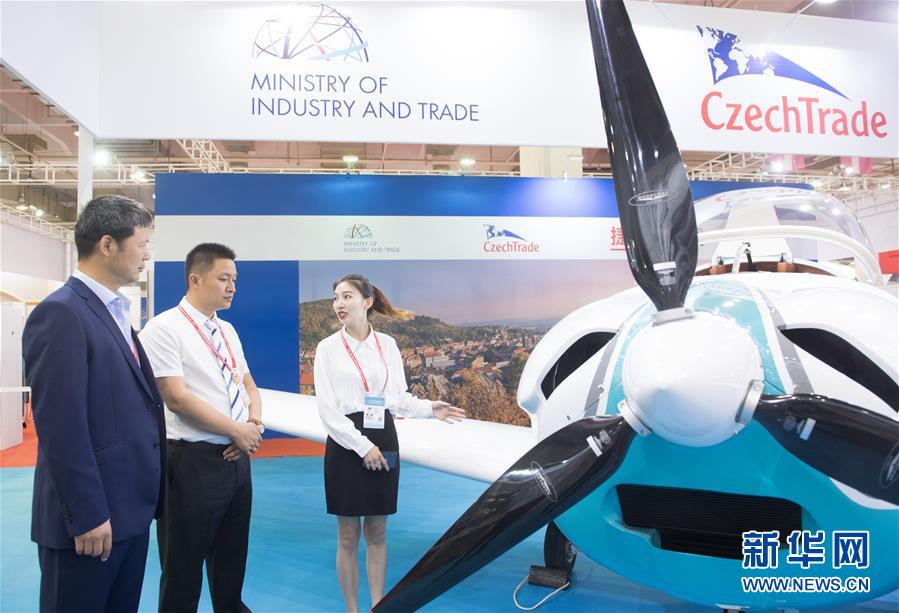 6月8日,在浙江寧波舉行的首屆中國-中東歐國家博覽會上,一名展商(右)在介紹捷克生產(chǎn)的一款輕型飛機(jī)。新華社記者 翁忻旸 攝