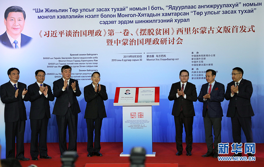 新華社烏蘭巴托8月30日電? 為慶祝中蒙建交70周年,由中國國務院新聞辦公室、蒙古國外交部、中國外文局、中國駐蒙古國大使館主辦的《習近平談治國理政》第一卷、《擺脫貧困》西里爾蒙古文版首發(fā)式暨中蒙治國理政研討會在蒙古國首都烏蘭巴托舉行。蒙古國總統(tǒng)巴特圖勒嘎發(fā)來賀信。中宣部副部長蔣建國、中國駐蒙古國大使邢海明,蒙古國副總理恩赫圖布辛、外交部長朝格特巴特爾、總統(tǒng)外事顧問特格希扎爾格勒、蒙古人民黨書記巴特恩赫等260多名代表參會。
