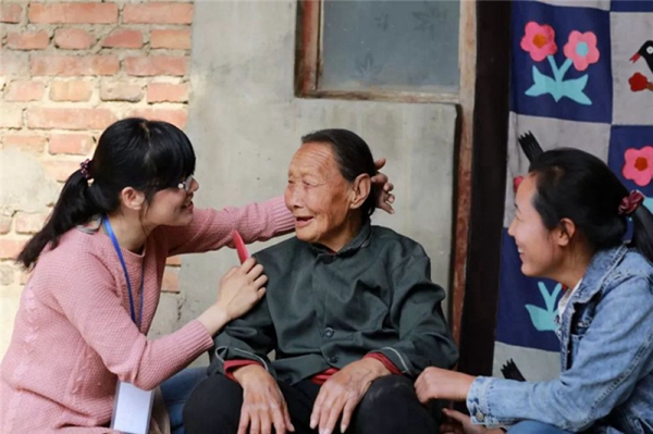2016年4月11日,河北省邢臺(tái)市內(nèi)丘縣金店鎮(zhèn)韓郝莊村大學(xué)生“村官”田少微(左)在和孤寡老人聊天。