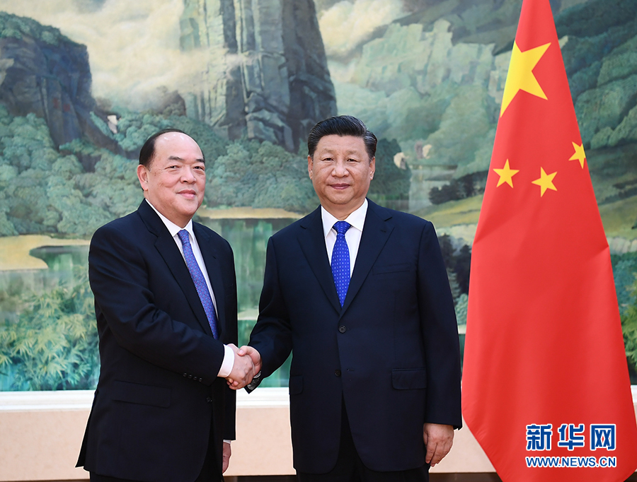 9月11日,國家主席習近平在人民大會堂會見新當選并獲中央政府任命的澳門特別行政區(qū)第五任行政長官賀一誠。 新華社記者 謝環(huán)馳 攝