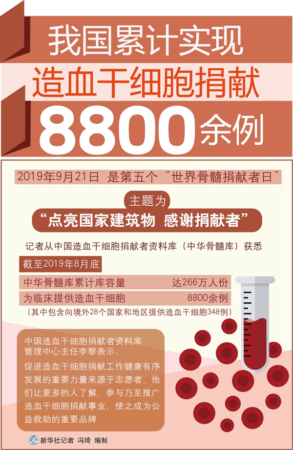 新華社西安9月21日電(記者藺娟 吳鴻波)記者從中國造血干細(xì)胞捐獻(xiàn)者資料庫(中華骨髓庫)獲悉,截至2019年8月底,中華骨髓庫累計庫容量已達(dá)266萬人份,為臨床提供造血干細(xì)胞8800余例,其中包含向境外28個國家和地區(qū)提供造血干細(xì)胞348例。
