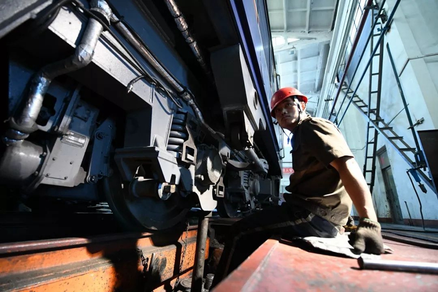 10月2日,內(nèi)蒙古巴林右旗。當(dāng)?shù)罔F路職工為機(jī)車更換車輪。作者:這么近那么遠(yuǎn)