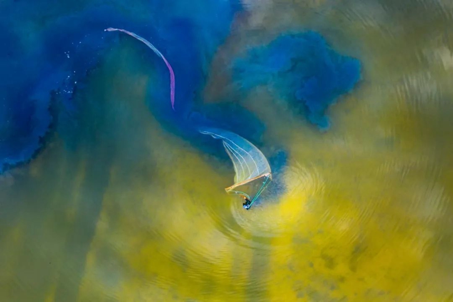 8月28日,山西運(yùn)城。撈蟲人在鹽湖中撈鹽水蟲。作者:尚建周