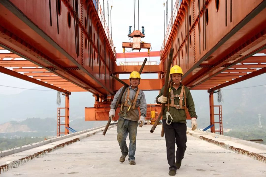 9月30日,浙江仙居。建設(shè)者們在臺金鐵路永安溪特大橋上施工。作者:王華斌