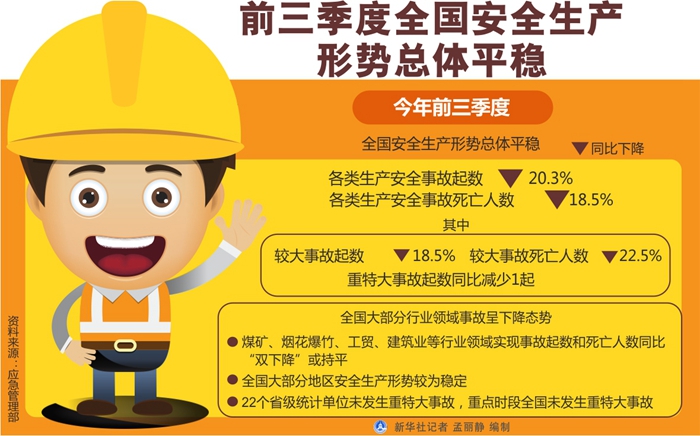 應(yīng)急管理部有關(guān)負(fù)責(zé)人表示,前三季度,全國(guó)大部分行業(yè)領(lǐng)域事故呈下降態(tài)勢(shì)。煤礦、煙花爆竹、工貿(mào)、建筑業(yè)等行業(yè)領(lǐng)域?qū)崿F(xiàn)事故起數(shù)和死亡人數(shù)同比“雙下降”或持平。全國(guó)大部分地區(qū)安全生產(chǎn)形勢(shì)較為穩(wěn)定。22個(gè)省級(jí)統(tǒng)計(jì)單位未發(fā)生重特大事故,重點(diǎn)時(shí)段全國(guó)未發(fā)生重特大事故。