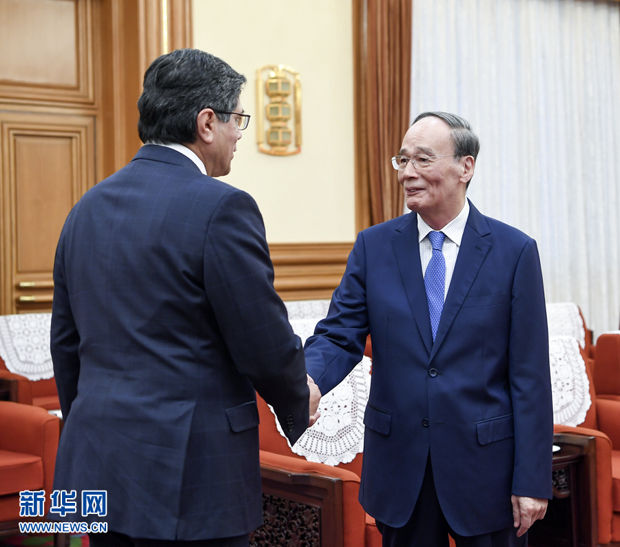 11月1日,國家副主席王岐山在北京中南海會見厄瓜多爾外長瓦倫西亞。 新華社記者 張領 攝