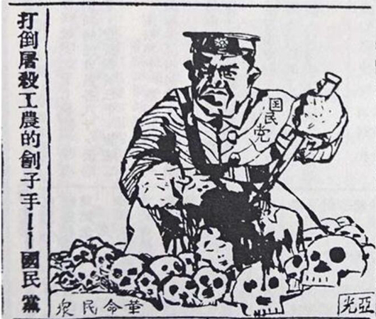 1933年7月14日,《紅色中華》第1版刊發(fā)潘漢年撰寫的社論《反對國民黨法西斯的白色恐怖》,文章配發(fā)黃亞光創(chuàng)作的漫畫《打倒屠殺工農(nóng)的劊子手——國民黨》,畫面上的國民黨兇手舉著滴血的屠刀,踏著一堆革命群眾的尸骨,將國民黨反動(dòng)派與人民為敵的本性揭露無遺。