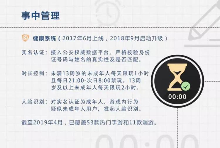 以目前體系搭建最全面的騰訊為例,2017年7月開始,以《王者榮耀》為試點(diǎn),推出“健康游戲防沉迷系統(tǒng)”,限制未成年人每天登錄時長;2018年9月起,對新用戶身份信息與公安權(quán)威數(shù)據(jù)平臺進(jìn)行比對,以此為標(biāo)準(zhǔn)決定是否將新用戶納入未成年人防沉迷體系……