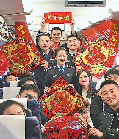 太原鐵路公安處民警在太原開往西安的高鐵上宣傳安全知識,與旅客互動。趙 彤?dāng)z(影像中國)