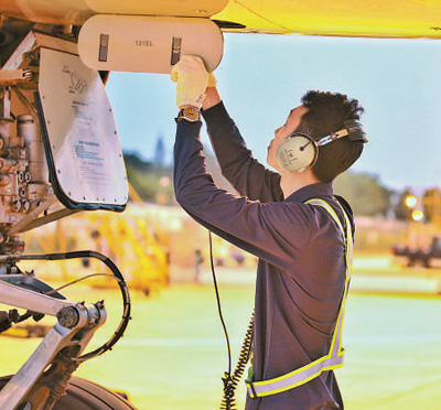 10日,機(jī)務(wù)人員進(jìn)行起飛前的各項檢查。當(dāng)日,海口美蘭機(jī)場飛往北京大興機(jī)場的首個航班順利起航。朱榮鵬 紀(jì)巧珠攝影報道(影像中國)