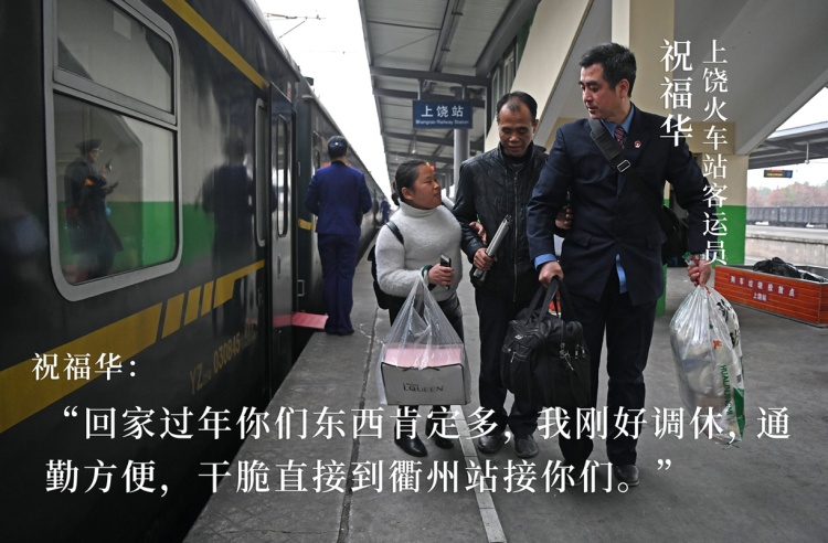 祝福華是上饒火車(chē)站的一名客運(yùn)員,經(jīng)常在車(chē)站碰到他們,每次都熱心地幫忙提行李,護(hù)送進(jìn)出站,日子久了就互相留了電話(huà)和微信以方便聯(lián)系。只要魯師傅夫婦有需要,即便沒(méi)在班上,祝福華也會(huì)趕到車(chē)站幫助他們。