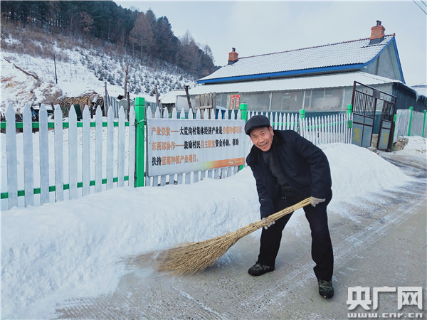 記者來到王召運(yùn)老人家時(shí),他正在掃雪(記者 王啟慧 攝)