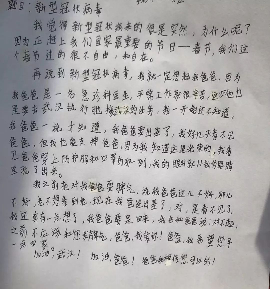信里他先反思了一下自己,說以前盼望著爸爸上班,不希望爸爸在家管他?,F(xiàn)在爸爸去前線,我想到危險性,現(xiàn)在又特別希望爸爸安安全全地回家,然后還說了一句,爸爸我愛你!以前從來沒有過。我跟他說,我希望你在生活和學(xué)習(xí)中面對困難,無所畏懼,一直向前,我還說爸爸不一定是你的驕傲,但一定要做你的榜樣。