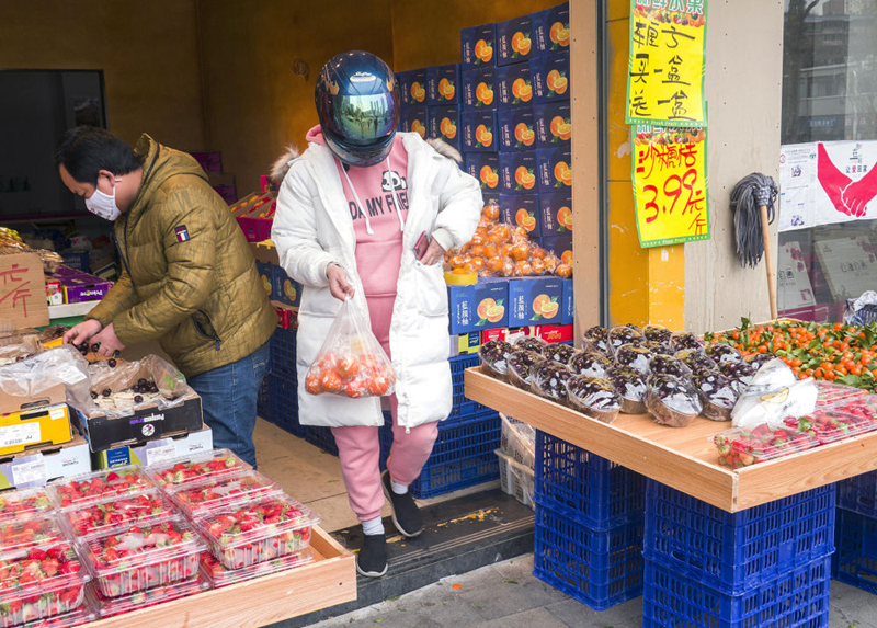 2月8日,在武漢市江漢區(qū),一名女子外面戴著摩托車頭盔,里面戴著口罩在水果店采購。