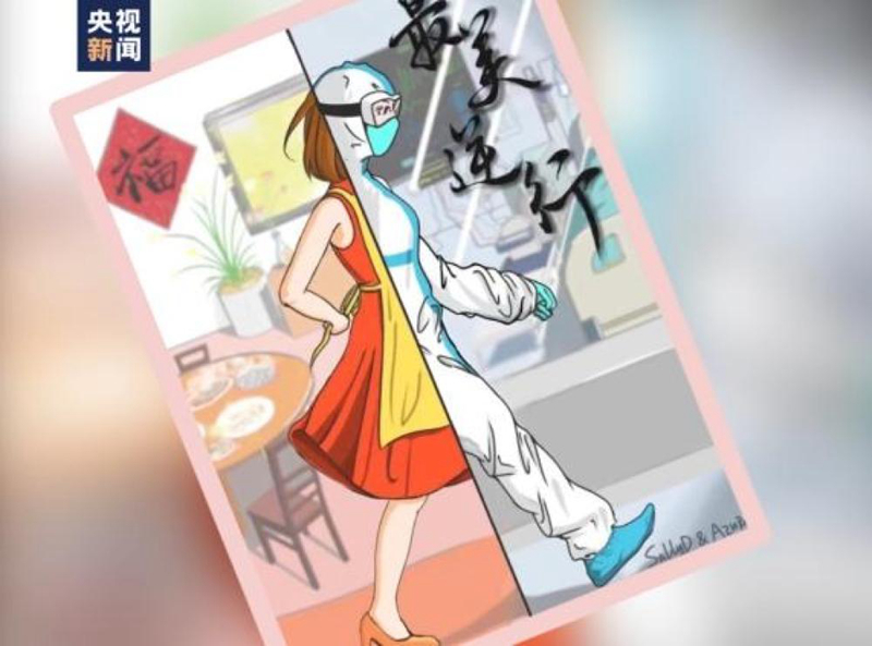 設(shè)計(jì)師董思喬的母親,是北京大學(xué)人民醫(yī)院的一名醫(yī)務(wù)工作者。在董思喬七歲那年,正逢非典暴發(fā),她的母親堅(jiān)守崗位留在醫(yī)院救治患者。十七年后,新冠肺炎來(lái)襲,她看到很多醫(yī)務(wù)工作者也像當(dāng)年她的母親一樣在最危險(xiǎn)的地方戰(zhàn)斗,義無(wú)反顧,馳援武漢。于是,她拿出畫(huà)筆畫(huà)出她心中醫(yī)務(wù)工作者們最美的樣子:“身后,是飄香的飯菜,是溫馨的家;面前,是防疫一線,是需要救治的患者。逆行者們,愿你們平安歸來(lái)。”
