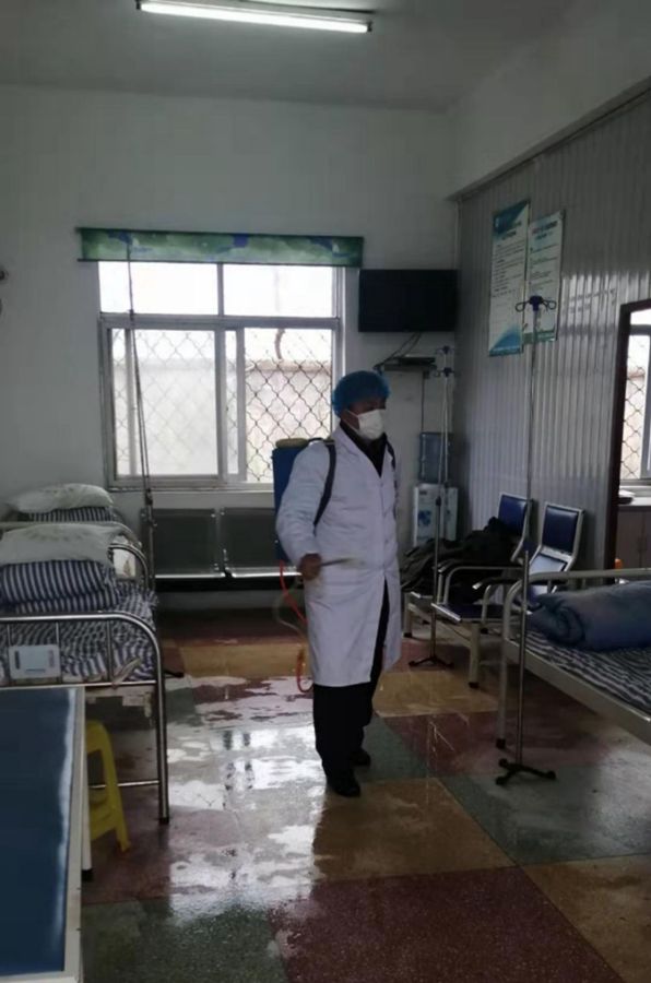 朱世勇在給衛(wèi)生室消毒。