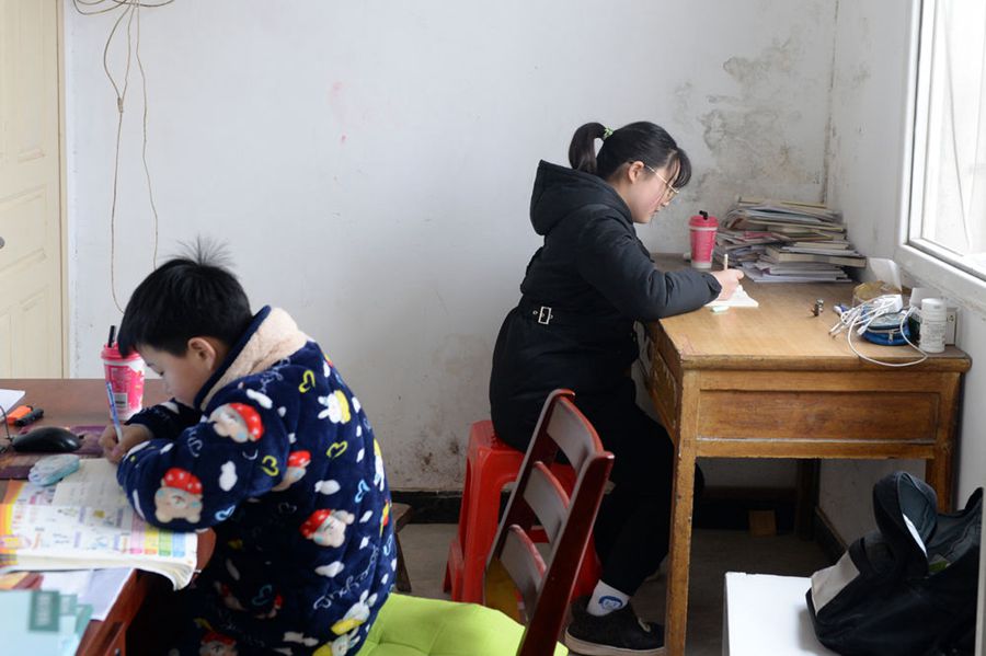 崔愛國和周超群的兩個孩子在衛(wèi)生室已消毒的隔間內(nèi)學(xué)習(xí)。(新華社記者黃博涵 攝)
