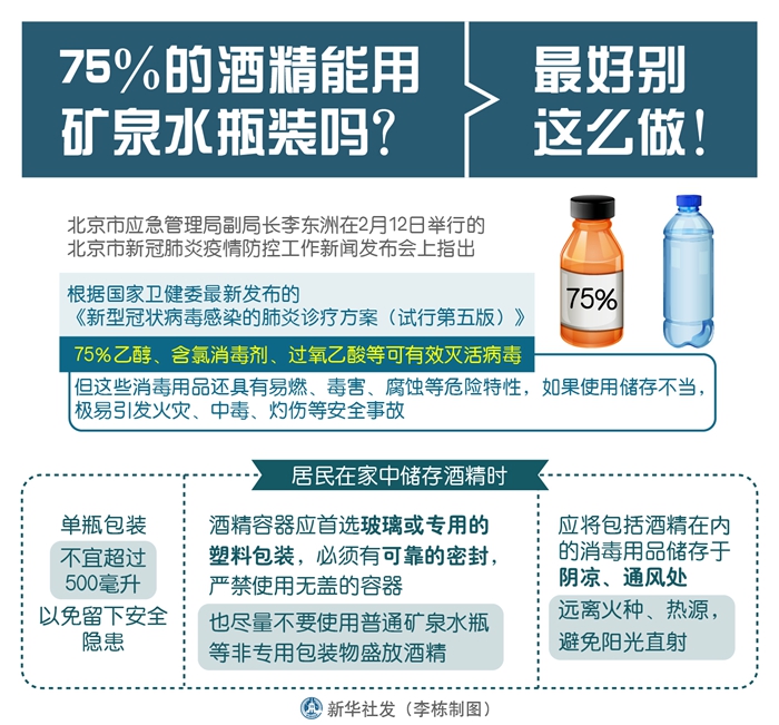 新華社北京2月13日電(記者丁靜)越來(lái)越多的人選擇常備75%的乙醇(俗稱酒精)進(jìn)行家庭和個(gè)人消毒。那么,75%的乙醇可以裝在礦泉水瓶里嗎?北京市應(yīng)急管理局副局長(zhǎng)李東洲在12日舉行的北京市新冠肺炎疫情防控工作新聞發(fā)布會(huì)上稱,最好別這么做。