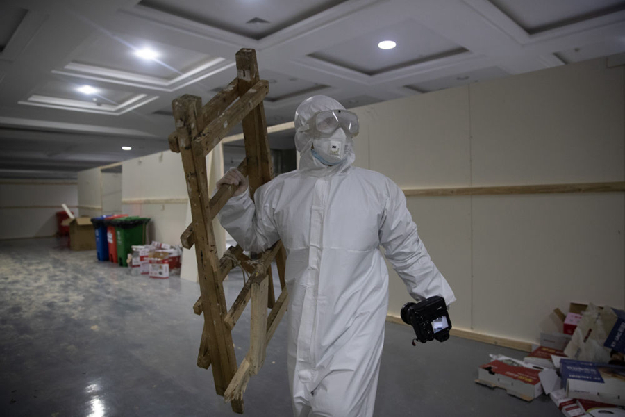 這些身影中還有被隔離的病人。江漢方艙醫(yī)院?jiǎn)⒂玫牡谝惶?,收治的首批病人里,有一個(gè)面目清秀的小伙子。入院躺下后,他打開(kāi)了一本《政治秩序的起源》,安靜地閱讀。口罩遮住了他的表情,但卻藏不住眼神里的平靜和專注??匆?jiàn)我舉起相機(jī),他輕輕擺了擺手,示意不用拍他,我猶豫片刻,還是執(zhí)意按下了快門。也許他并不明白,在有些喧囂的方艙醫(yī)院里,近乎靜止的他,是多么的令人震撼。