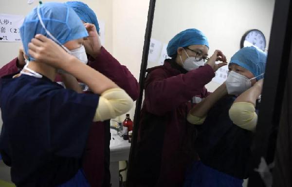 武漢協(xié)和醫(yī)院(西院),湘雅醫(yī)院感染病科醫(yī)生在穿防護(hù)衣。經(jīng)濟(jì)日?qǐng)?bào)記者高興貴攝