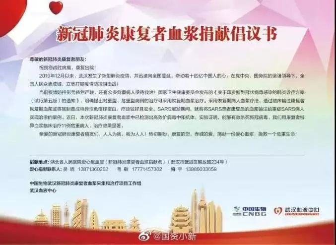 2月13日,金銀潭醫(yī)院院長(zhǎng)張定宇及中國(guó)生物武漢新冠肺炎康復(fù)者血漿采集和治療項(xiàng)目工作組、武漢血液中心均發(fā)出呼吁,懇請(qǐng)康復(fù)后的患者積極捐獻(xiàn)血漿??吹叫侣劊┡繘Q定來(lái)醫(yī)院捐血漿,希望自己血液里的抗體能幫助到其他患者,包括她的父親。