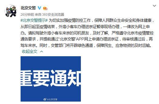 據(jù)北京市公安局公安交通管理局微博消息,為切實(shí)加強(qiáng)疫情防控工作,保障人民群眾生命安全和身體健康,從2月17日起至疫情結(jié)束,外埠小客車辦理進(jìn)京證暫?,F(xiàn)場辦理,一律改為網(wǎng)上申辦。