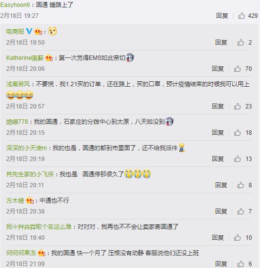 網(wǎng)友“滿杯甜酒椰”發(fā)布微博稱,“我十天沒動的韻達是不是可以更新一下物流惹”;網(wǎng)友“啵霸兔兔果茶”說,“圓通快遞怕是消失了,送個東西幾天不動一下”;網(wǎng)友“啊啊啊喵在等待”則調(diào)侃,“等中通快遞把我的口罩寄到了,疫情也快結(jié)束了吧”。